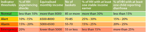 Concern Worldwide a apporté son soutien à la mairie de Nairobi pour une réponse rapide et une diminution de la lenteur de réaction sur le terrain face aux urgences en établissant un système urbain d'avertissement et d'action rapide (UEWEA). Le système UEWEA est issu du projet Indicator Development and Surveillance for Urban Emergencies (IDSUE) que Concern Worldwide a piloté avec succès pendant cinq ans dans des colonies informelles de Nairobi. Le système se base sur cinq indicateurs clés : le pourcentage de foyers subissant des chocs ; le revenu mensuel standardisé ; le nombre de paniers alimentaires ; le pourcentage de foyers avec au moins un soutien économique stable ; et le pourcentage de foyers avec au moins un enfant présentant des diarrhées. La région reçoit le soutien de la Kenya Red Cross Society afin de recueillir des données mensuelles des colonies informelles à entrer dans le système UEWEA, pour ensuite les classer dans les catégories "normal", "alerte", "alarme" ou "urgence". Des seuils ont été fixés pour chaque catégorie selon les données de la phase pilote de cinq ans (cf Tableau 1). Une fois le seuil normal dépassé, le gouvernement régional mobilise des ressources afin de répondre à la situation ; des actions de réponse d'urgence sont lancées lorsque les indicateurs de UEWEA transmettent une situation d'urgence, vous pourrez en trouver un exemple dans l'encadré 2.
