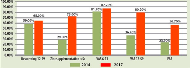 Les résultats des études de nutrition SMART conduites en 2014 et 2017 indiquent des améliorations marquées dans la prise en charge de tous les indicateurs HINI de cette période, dont le traitement vermifuge des enfants de 12 à 59 mois (de 59,0 % à 65,1 % contre un objectif de 50 %) ; la complémentation en zinc contre la diarrhée parmi les enfants de moins de cinq ans (de 29,0 % à 73,0 % contre un objectif de 80 %) ; la complémentation en vitamine A des enfants de 6 à 11 mois (de 81,7 % à 87,2 %) et des enfants de 12 à 59 mois (de 36,4 % à 80,2 %)(contre un objectif de 80 % pour les 6-59 mois) ainsi que la complémentation en fer et acide folique (IFAS)(de 23,9 % à 56,7 % contre un objectif de 80 %) (Graphique 1). Alors que les objectifs ont été atteints pour deux indicateurs HINI (traitement vermifuge et complémentation en vitamine A), la complémentation en zinc contre la diarrhée parmi les enfants de moins de cinq ans a manqué de peu d'atteindre son objectif. Les résultats des IFAS pour les femmes enceintes se sont améliorés mais sont loin d'atteindre l'objectif fixé. Des difficultés d'approvisionnement en sont la cause principale puisque les IFAS ne faisaient pas partie de la liste des médicaments essentiels ; cependant c'est le cas à présent, et à l'avenir toutes les femmes enceintes recevront le complément selon ce qui est prévu.
