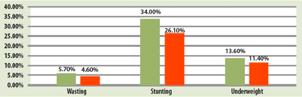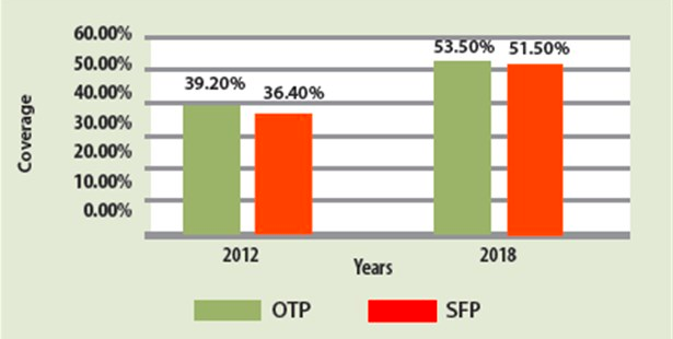 L'application du programme thérapeutique ambulatoire (OTP) dans la région est passée de 39,2 % en 2012 à 53,5 % en 2018, tandis que la mise en place du programme alimentaire complémentaire (SFP) est passée de 36,4 % en 2012 à 51,5 % en 2018 (Graphique 2). Les résultats des études SMART montrent que les cas de carences ont diminué, passant de 36,0 % en 2014 à 26,0 % en 2017 ; les cas d'émaciation sont passés de 5,7 % en 2014 à 4,6 % en 2017 ; et les cas de sous-poids sont passés de 13,6 % en 2014 à 11,4 % en 2017 (Graphique 3).