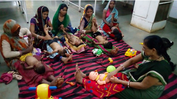 De plus, les conseillers CTM apprennent aux parents des exercices simples de relaxation, tels que le yoga et des exercices de respiration, dans le but d’améliorer leur humeur et de les aider à réduire le stress mental et la tension physique et à gérer leurs émotions efficacement. Ils apprennent également aux mères à prodiguer des massages quotidiens aux bébés afin de promouvoir un attachement sécure et de favoriser la récupération et le développement physiques et psychologiques de l’enfant. Les pères en visite sont également inclus dans les séances de massage afin d’encourager l’affection paternelle et l’attachement au bébé. Des séances quotidiennes de jeu d’une heure sont aussi organisées dans le but de stimuler le développement physique et cognitif des enfants hospitalisés et de renforcer encore les liens entre le parent et l’enfant.