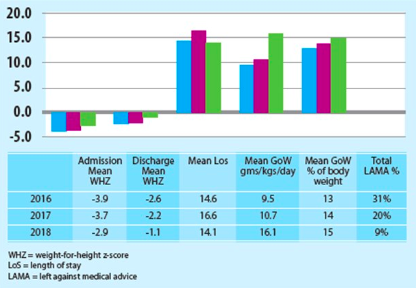 - La différence moyenne de poids-pour-taille entre l’admission et la sortie a baissé de 1,5 écart-type.