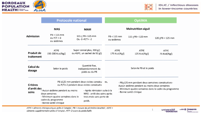 En 2016, ALIMA et ses partenaires burkinabés, Keoogo et SOS Médecins, en partenariat avec le Ministère de la Santé, ont conçu le protocole OptiMA-Burkina Faso sous la forme d'un essai pilote, comparé à un contrôle externe (à savoir, respectant les normes nationales burkinabé et les standards internationaux Sphère). La figure 1 montre les différences entre le protocole actuel du Burkina Faso et OptiMA. La figure 2 présente le tableau des dosages réduits, qui résout le paradoxe posologique actuel selon lequel les enfants reçoivent davantage d'ATPE à la fin du traitement, même après que leur poids s'est stabilisé.