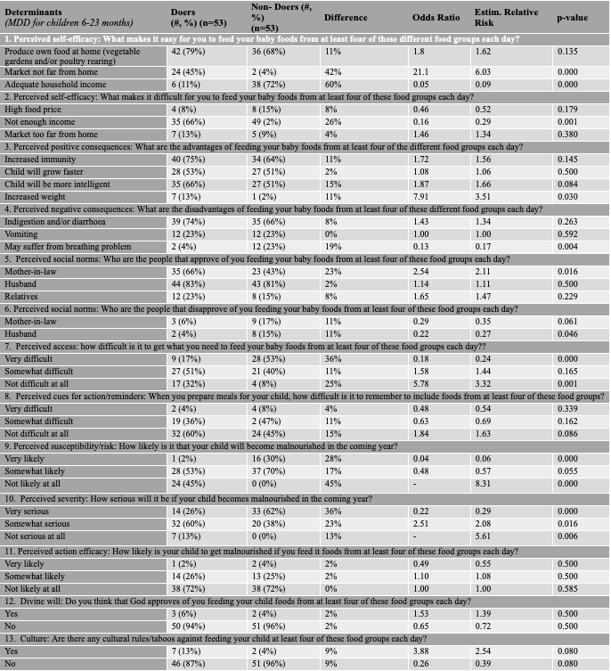 Table 1 shows a summary of the barriers and facilitators constructs generated from the data. Overall, an overwhelming proportion of respondents from both groups (doers and non-doers) identified economic factors (e.g. household income and food price) as the main facilitator for achieving MDD. As most households were primarily reliant on markets for access to food, distance to the market was also a big predictor. The barrier analysis additionally identified existing misconceptions around consuming a diversified diet (e.g. certain foods can cause indigestion/breathing problems) and a lack of full understanding of the benefits, as well as perceived difficulty of remembering to include foods from different food groups, as other important determinants of MDD. Approval and support of husbands and mothers-in-law were found necessary for practising the behaviours. However, no social, cultural or religious restrictions or taboos against consumption of a diversified diet by women or children were identified.