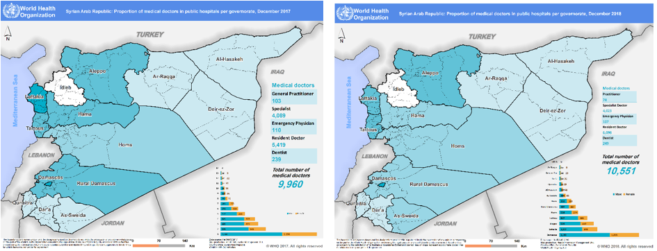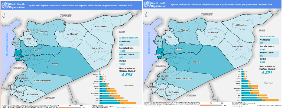 En raison de la crise, les services de santé en Syrie ont été fortement perturbés, les attaques ont endommagé les centres de santé et, dans certains cas, les ont mis hors service, réduisant ainsi significativement l’accès à des services de santé essentiels pour les populations touchées. Jusqu’à la fin de l’année 2018, sur 1811 centres de santé publique contrôlés, seulement 68% ont été déclarés fonctionnels (46% totalement et 22% en partie) et sur 11 hôpitaux publics, 76% ont été déclarés fonctionnels (52% totalement et 24% en partie). Trente-et-un pour cent des centres de santé ont été déclarés endommagés (7% totalement et 24% en partie), ainsi que 45% des hôpitaux (11 % totalement et 34 % en partie) (HeRAMS 2018a; HeRAMS 2018b). La Figure 1 présente l’emplacement des centres de santé fonctionnels et hors service dans le pays. Elle révèle que les zones très vulnérables et difficiles d’accès ou assiégée disposent de services de santé limités. Cette situation a été exacerbée par le fait que 50% des professionnels de santé ont soit fui la Syrie, soit se sont réfugiés dans des régions du pays plus sûres. Les professionnels de santé sont en plus grand nombre dans les zones considérées plus sûres (principalement dans les gouvernorats du centre du pays), tandis que les zones vulnérables au nord-est, nord-ouest et sud connaissent un manque de professionnels de santé compétents et disponibles (Figures 2 et 3).