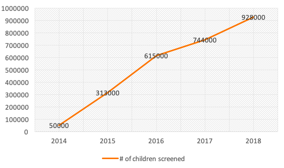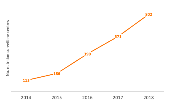 Entre 2014 et 2018, le nombre de centres de surveillance nutritionnelle est passé de 115 à 802, gagnant approximativement 200 centres de santé par an dans tout le pays (Figure 6) et augmentant ainsi le nombre d’enfants dépistés (Figure 7). En 2018, sur 928 000 enfants dépistés, la prévalence de MAG était de 2,4% (1,8% de MAM, 0,6% de MAS et 0,1% de MAS avec complication). Ces patients ont été renvoyés vers les PAS, PTA, et CS pour recevoir un traitement.