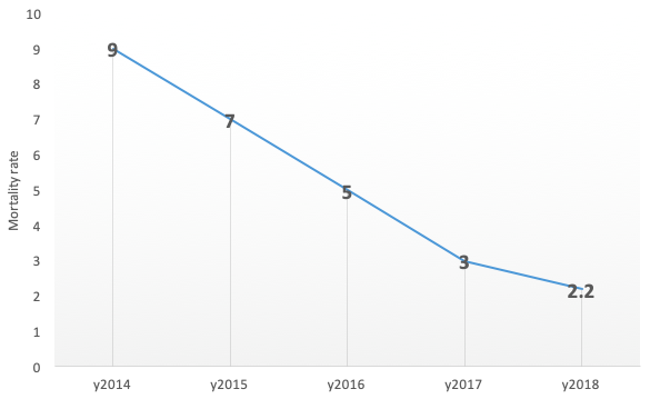 Avant la crise, le Ministère de la Santé avait le leadership des initiatives relatives à la nutrition et l’OMS fournissait des recommandations techniques concernant le suivi de la croissance et les initiatives concernant l’alimentation du nourrisson et du jeune enfant (par exemple, le Code international de commercialisation des substituts du lait maternel et l’Initiative des hôpitaux amis des bébés). Pendant la crise, l’OMS a pris les devants en matière de surveillance nutritionnelle et de prise en charge de la MAS avec complications, en collaboration avec le Ministère de la Santé, les ONGs et les partenaires du secteur de la santé. Pour prendre en charge la MAS avec complication, l’OMS a soutenu, depuis 2014, la création de 10 CS au sein des départements de pédiatrie des principaux hôpitaux publics. Des CS supplémentaires ont été créés dans des hôpitaux privés et mis en œuvre par les ONGs dans les zones où les services publics étaient trop gravement endommagés ou inaccessibles (Figure 11). L’OMS a apporté son appui aux CS au moyen du renforcement des capacités du personnel de santé (formation de 350 professionnels de la santé aux protocoles en vigueur de prise en charge de la MAS) et de l’approvisionnement en médicaments, fournitures médicales et équipement pour la pris en charge de la MAS (comme les équipements anthropométriques, les antibiotiques, les minéraux, les vitamines et les laits thérapeutiques F75 et F100) et d’une assistance technique concernant les protocoles de traitements et le reporting. Le taux de patients référés indique une grande complémentarité des programmes. En 2017, tous les cas de MAS avec complications référés vers des CS avaient été pris en charge, comparé à 60% des cas en 2015. En outre, le renforcement des capacités et le soutien continu ont permis l’amélioration de la mise en place et de la qualité des programmes. Cela s’est traduit par une réduction de la durée moyenne d’hospitalisation de 12 à environ 6 jours et une réduction de la mortalité de 9% à 2,2% en 4 ans (Figures 12 et 13). Ceci témoigne de la grande efficacité et de la qualité des services.