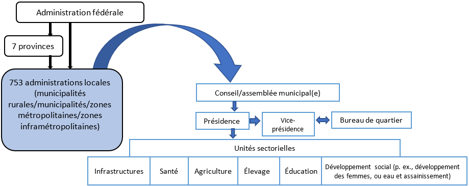 La Constitution de 2015 du Népal répartit les pouvoirs entre trois niveaux de gouvernement (fédéral, provincial et local – municipalités et quartiers) (figure 1) et promeut la démocratie sociale au niveau des municipalités et des quartiers. Les autorités municipales sont habilitées à préparer et à mettre en œuvre des programmes périodiques à court ou long terme, notamment des plans sectoriels stratégiques annuels aux fins du développement local, en respectant l’orientation donnée par le gouvernement fédéral en faveur de la réalisation des objectifs de développement durable.
