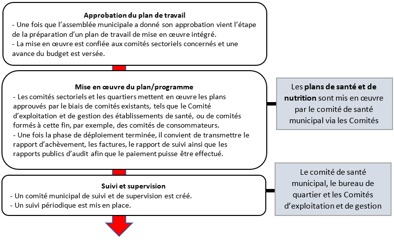 Conformément aux directives du gouvernement népalais, les municipalités conçoivent un plan de mise en œuvre intégré après avoir obtenu l’approbation de l’assemblée municipale. S’agissant des plans de santé et de nutrition, les sections municipales dédiées à la santé élaborent et mettent en œuvre les programmes par le biais des Comités d’exploitation et de gestion des établissements de santé. Les documents requis, notamment le plan de travail, les factures des dépenses et les rapports de fin de programme, sont transmis à la municipalité à des fins de paiement. La section de la santé est chargée de la mise en œuvre des activités spécifiques aux questions de nutrition, tandis que les activités sensibles à cet aspect sont déployées par les sections concernées (par exemple, la section responsable de l’agriculture assurera la distribution des semences de légumes). Les municipalités et les quartiers effectuent un suivi périodique des plans sanitaires. Ce processus est décrit dans la figure 3.
