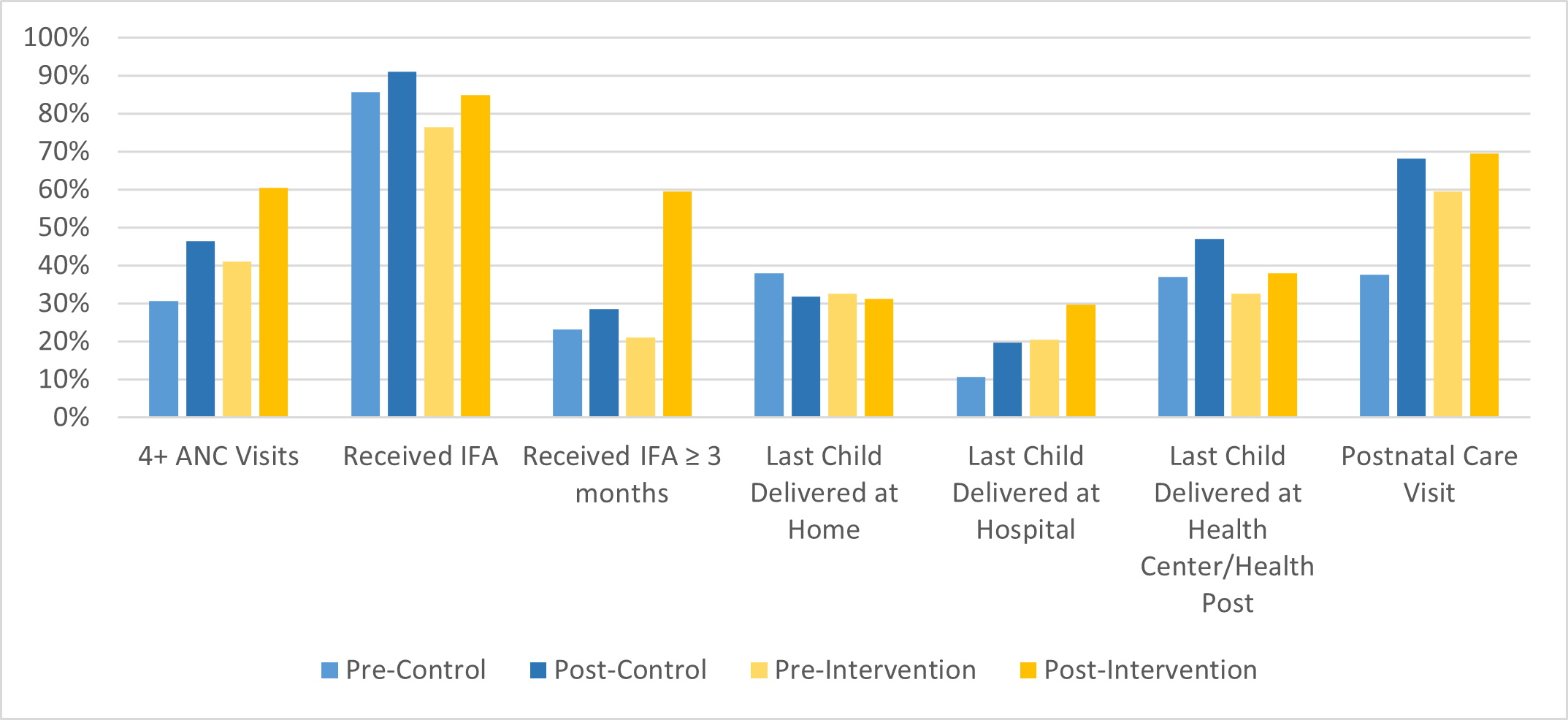Les participants à l’étude de la documentation relative aux conversations communautaires améliorées ont souvent cité la prise de suppléments de fer et d’acide folique parmi les changements de comportement des femmes enceintes provoqués par leur participation aux conversations communautaires améliorées et les visites à domicile des agents du changement communautaire. L’étude comparative sur l’efficacité du contenu virtuel confirme ces conclusions, en particulier dans le groupe expérimental (figure 3), où la prise de fer et d’acide folique pendant au moins trois mois est passée de 21 % à 60 %. Ce taux a également progressé dans le groupe de contrôle, mais de manière beaucoup plus limitée (de 23 % à 29 % (p = 0,004)). L’étude comparative sur l’efficacité du contenu virtuel a en outre révélé une hausse du pourcentage de femmes ayant bénéficié d’au moins quatre consultations de soins prénatals dans le groupe de contrôle (de 30,7 % à 46,4 %) et dans le groupe expérimental (de 41 % à 60,5 %), avec une progression nettement plus importante dans le second groupe (p=0,04). On constate également une hausse significative de la proportion de femmes ayant reçu des soins postnatals dans les deux jours suivant l’accouchement aussi bien dans le groupe de contrôle (de 37,5 % à 68,2 %) que dans le groupe expérimental (de 59,4 % à 69,5 %). La différence beaucoup plus importante dans le groupe de contrôle (p = 0,004), montre bien que les conversations communautaires améliorées contribuent à favoriser la recherche de soins de santé dans les deux groupes. En revanche, seule une légère amélioration est à noter dans les deux groupes pour ce qui est des accouchements en milieu médicalisé (hôpital, centre de santé ou poste sanitaire) avant et après les interventions liées au programme.