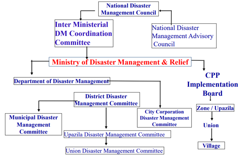 Tel qu’illustré dans la figure 1, il existe trois forums nationaux de coordination de l’intervention du gouvernement face aux catastrophes placés sous l’autorité du ministère de la Gestion des catastrophes et des Secours d’urgence. Le conseil national de gestion des catastrophes est responsable de la prise de décisions stratégiques dans ce domaine, tandis que le comité interministériel de gestion des catastrophes assure la coordination entre ministères. Enfin, le comité consultatif national pour la gestion des catastrophes élabore et oriente les politiques. Le conseil national est l’instance décisionnelle de plus haut niveau en matière de gestion des catastrophes au Bangladesh. À l’échelle infranationale, des comités de gestion des catastrophes ont été constitués afin que les plus petites subdivisions géographiques (les upazilas) dirigent les efforts régionaux de réduction des risques de catastrophes. Présidé par le secrétaire du ministère de l’Alimentation et de la Gestion des catastrophes, le conseil de mise en œuvre du plan de préparation aux cyclones fournit un soutien administratif et à l’exécution de mesures pour renforcer la préparation et les interventions collectives face aux cyclones dans les districts exposés.