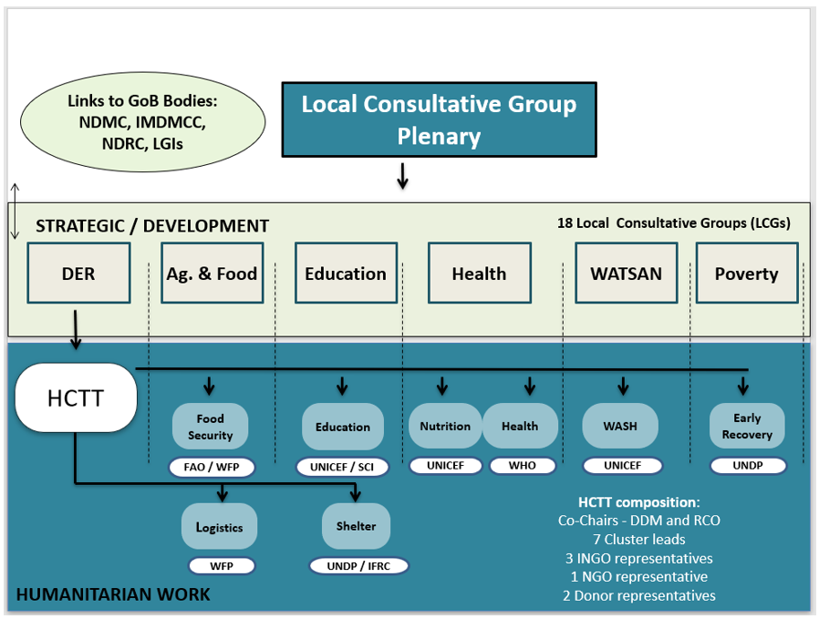 En 2012, dans le cadre de la modification du système national de clusters, le groupe consultatif local du gouvernement pour les interventions en cas d’urgence et de catastrophe a officiellement approuvé la création d’un cluster national Nutrition dirigé par le gouvernement bangladais (et non par le Comité permanent interorganisations). Le cluster national Nutrition a pour but de renforcer les capacités en matière de nutrition du groupe consultatif local et du gouvernement en vue de la préparation et des interventions face aux situations d’urgence soudaines et à évolution lente au Bangladesh, principalement celles liées aux catastrophes naturelles. En dehors des périodes de crise, le cluster national Nutrition participe à l’élaboration de plans d’urgence qui comprennent notamment des mesures de préparation minimales (pour les risques dont la probabilité de concrétisation et les répercussions sont considérées comme peu ou moyennement importantes) et avancées (pour les risques dont la probabilité de concrétisation et les répercussions sont considérées comme très importantes). Les mesures de préparation minimales sont destinées à être prises par le gouvernement (dans le cadre de programmes de développement) et par les acteurs humanitaires afin de favoriser la coordination, la qualité et la mise en œuvre en temps opportun des interventions face aux crises.
