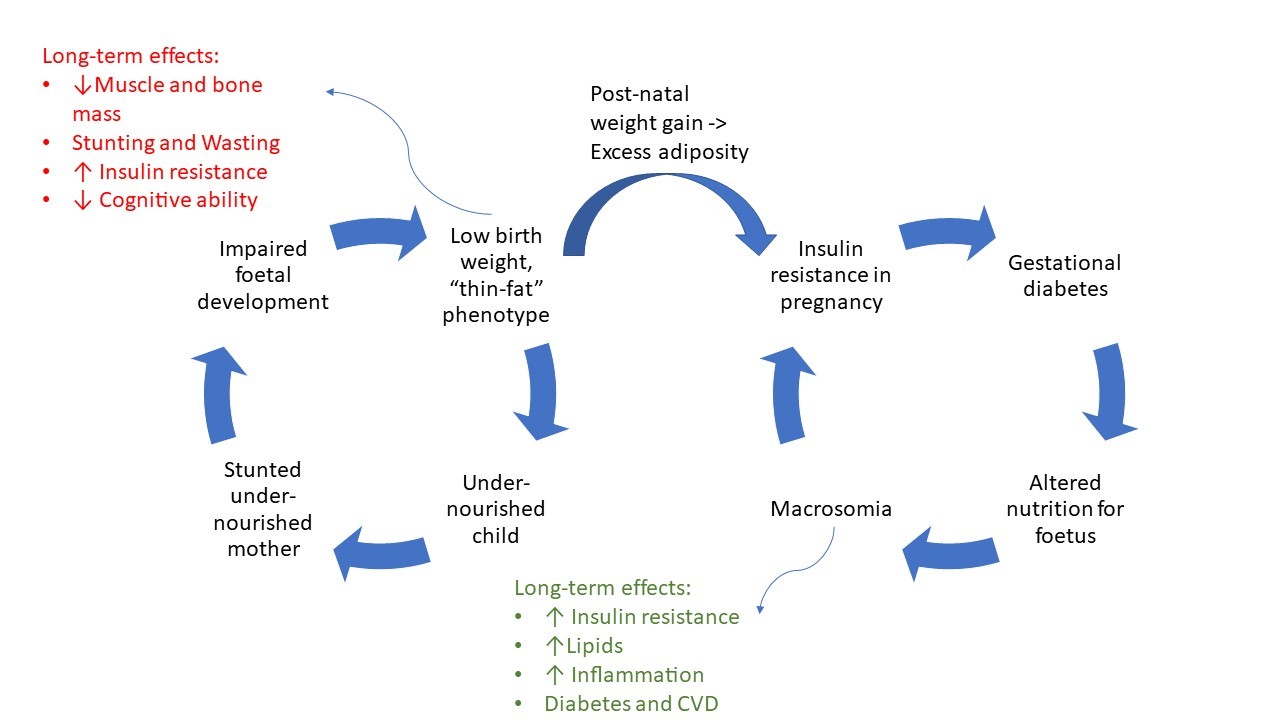 These studies have taught us that maternal and child nutrition are very important driving factors for lifelong health and the health of the next generation. In Southeast Asia, this is especially pertinent due to the dangerous combination of very high low birth weight (LBW) rates and transitioning diets. Perhaps due to the severity of foetal undernutrition, it appears to take very little transition and only a subtle increase in childhood adiposity to produce these metabolic changes and subsequent non-communicable diseases (NCDs) in this context which, in turn, leads to problems in the next generation. The cycle of undernutrition, subsequent subtle weight gain and the resultant NCDs is depicted in Figure 1.