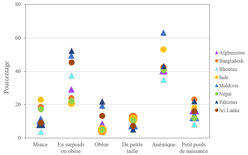 3 Données issues d’enquêtes représentatives à l’échelle nationale : enquête nationale sur la nutrition en Afghanistan (2013) et enquête démographique et de santé d’Afghanistan (EDS) (2015) ; EDS du Bangladesh (2011 et 2014) et enquête sur l’insuffisance pondérale à la naissance au Bangladesh (2015) ; enquête « STEPS 2014 » de l’OMS au Bhoutan et enquête nationale sur la nutrition au Bhoutan (2015) ; enquête nationale sur la santé des familles en Inde (NFHS-4) (2016) ; DHS des Maldives (2016-2017) ; DHS du Népal (2016) ; DHS du Pakistan (2017-2018) et enquête nationale sur la nutrition au Pakistan (2018) ; et DHS du Sri Lanka (2016).