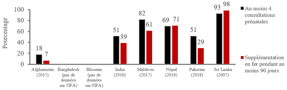 Figure 3 : Couverture de la population cible de femmes ayant effectué au moins quatre consultations prénatales et ayant reçu une supplémentation en fer pendant au moins 90 jours pendant leur grossesse dans les pays d’Asie du Sud5