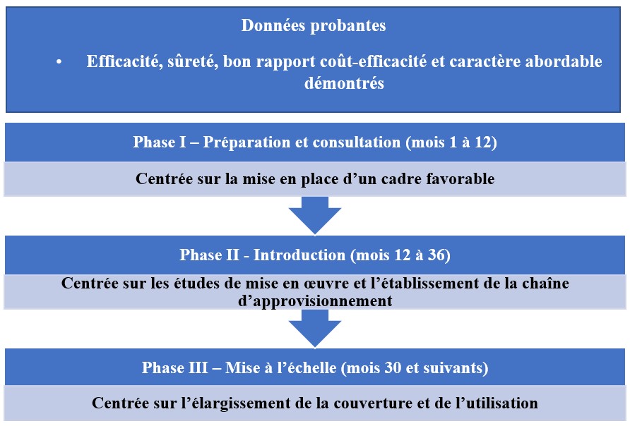 La figure 1 présente un modèle général à suivre (ou feuille de route) pour l’introduction et la mise à l’échelle de toute innovation en matière de soins de santé. Ce modèle est fondé sur des expériences passées d’introduction et de mise à l’échelle d’interventions de santé publique consistant, par exemple, en la distribution de sels de réhydratation orale pour le traitement de la diarrhée (Ruxin, 1994) ou en la mise en œuvre de différentes méthodes de contraception. Il contribue à identifier un « point de départ » dans le cadre du renforcement de l’utilisation d’une supplémentation en MMN et comporte les trois phases décrites ci-après.