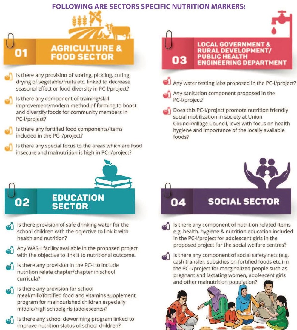 Afin de s’assurer que la réduction du retard de croissance est incorporée à la planification des activités par secteur, le secrétariat de la province du Khyber Pakhtunkhwa pour le mouvement SUN a établi une liste de critères de nutrition généraux (figure 1) et sectoriels (figure 2) à l’usage des autorités provinciales dans le cadre de l’évaluation des demandes de financement de projets. Ces critères en matière de nutrition ne sont jusqu’à présent employés qu’au Khyber Pakhtunkhwa, mais il est prévu d’étendre leur utilisation à d’autres provinces.