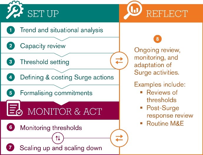 The development and implementation of the Health Surge approach must be grounded in the national and local health systems and embedded within or synchronised with other health system strengthening and quality improvement efforts and be based on a strong understanding of the capacity of the health system at different levels. On a practical level, it can borrow heavily from the tools and guidance that have successfully supported the scale-up of CMAM Surge. Therefore, revisions to the existing CMAM Surge Operational Guide will form the basis for the Health Surge approach. All eight steps from CMAM Surge will remain the same for Health Surge for the time being, although this may be adjusted as we learn. The main changes occur at the planning stage and in steps 1 to 4 (Figure 3).