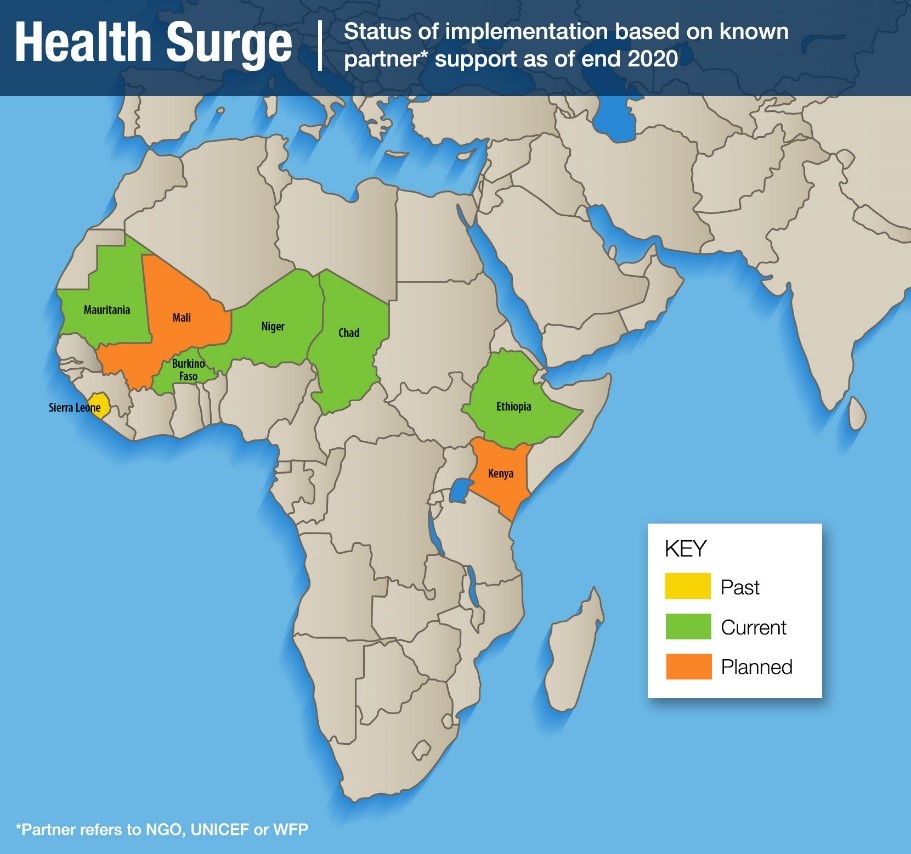 Health Surge: The goal of the Health Surge approach is to support the health system, and empower health workers, to better anticipate, prepare for and manage fluctuations in the demand for essential nutrition and child health services. The modalities of this approach are currently being developed.