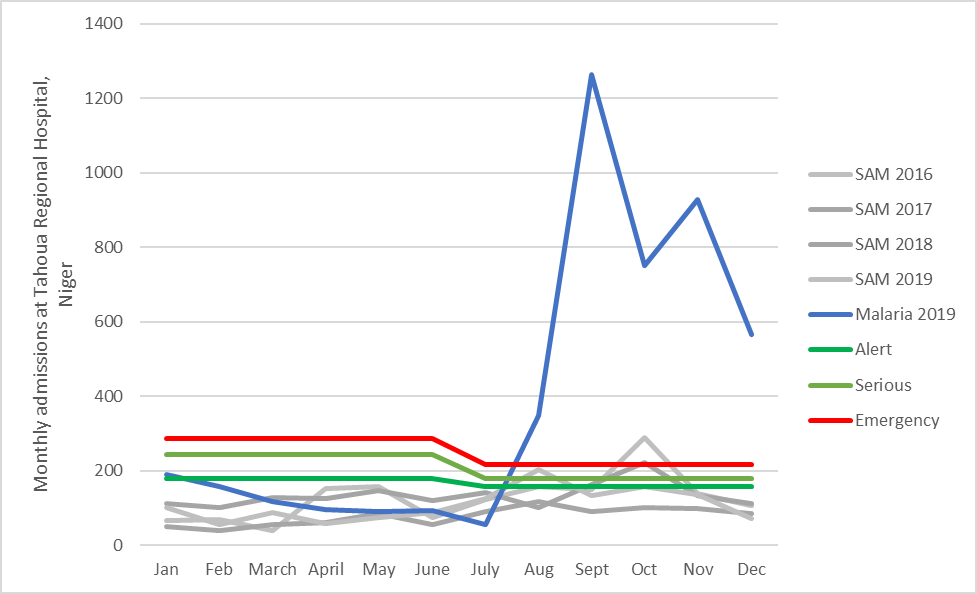 Figure 2: Severe wasting admissions and CMAM Surge dual thresholds, Tahoua Regional Hospital, Niger (2019)