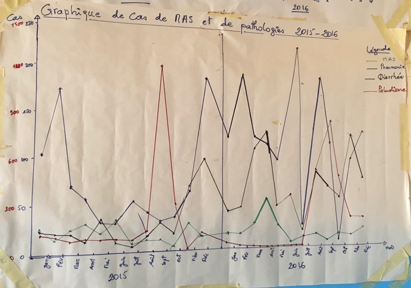 The most immediate questions were: what data should be collected, how often and how should the data be used? The government’s disease surveillance system was already tracking and reporting confirmed COVID-19 cases where testing was available. Given the low testing capacity in Tahoua, however, the Concern team began exploring the feasibility of using fever, diarrhoea and/or acute respiratory infection (ARI) as a proxy marker for COVID-19 and setting some broader workload thresholds that would define when health facility teams needed to take additional measures or seek external support. Diarrhoea and ARI data are routinely collected on a monthly basis to feed into the Health Management Information System (HMIS) and are monitored (usually on wall charts) as part of CMAM Surge. Of these, data on ARI seemed to be the most relevant and accessible, as diarrhoea was not considered a reliable sign of possible COVID-19 infection and fever data was not readily available and/or not reliable unless combined with malaria testing results. Given COVID-19 cases are more prevalent in adults, the programme decided to track ARI cases for all age groups – not just in children under five years, as is done routinely in CMAM Surge.
