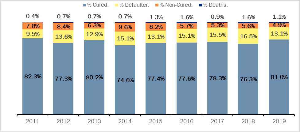 Les mesures susmentionnées ont contribué à une augmentation des admissions d’enfants souffrant d’émaciation sévère, qui sont passées de 21 658 en 2009 à 87 622 en 2019 (figure 3). Malgré cette hausse des admissions, les taux de guérison sont restés relativement stables, avec des taux de 81 % en 2019 (figure 4). Ces chiffres ne sont pas anodins si l’on tient compte du passage de services gérés par les ONG à des services gérés par le gouvernement, ainsi que des trois sécheresses survenues au cours de cette période.