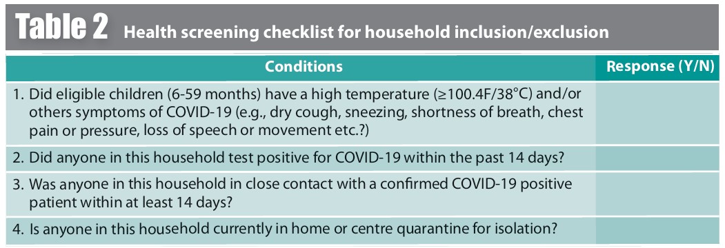 A standard health-screening checklist for interviewees was developed jointly in consultation with the Nutrition Sector and AIM-TWG members for the inclusion and exclusion of children and/or households. Body temperature was measured using an infrared digital thermometer and questions were asked as described in Table 2. If any household met any of the four conditions as explained in Table 2, the household was excluded from the survey. If any household had multiple eligible children but at least one child without fever or other COVID-19 signs/symptoms and no other family history of COVID-19 infection, these households were included in the survey. Any other household members with a high fever or other signs or symptoms were asked to isolate from the survey team but this was not considered a household exclusion criteria.