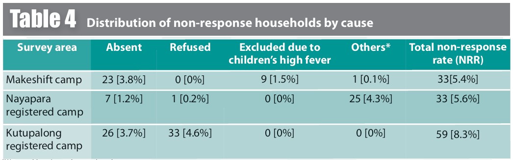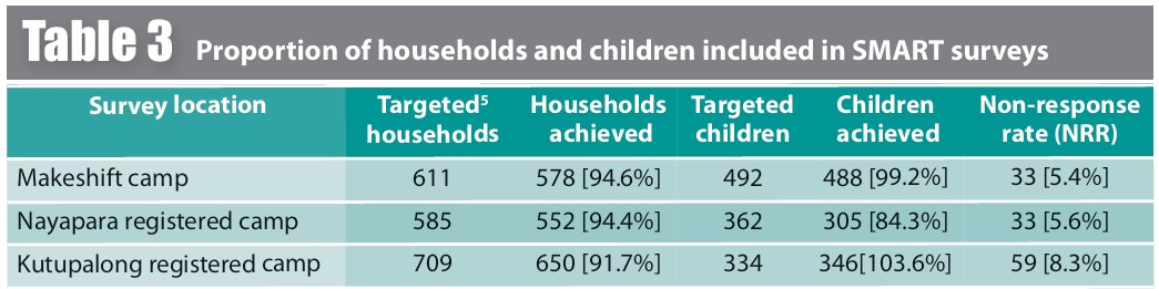 Although the original plan was to revisit non-response households for inclusion in the survey, this was not required as all three surveys had achieved adequate samples despite the exclusion of some households. The overall data quality for the three surveys was either “good” (Makeshift camp) or “excellent” (the two registered camps) as per the SMART plausibility score. The overall quality of the survey for the Makeshift camp was high but a penalty was given for a standard deviation (SD) of weight-for-height Z-score (WHZ) (SD value <=0.8; acceptable) which was due to higher homogeneity in that camp.