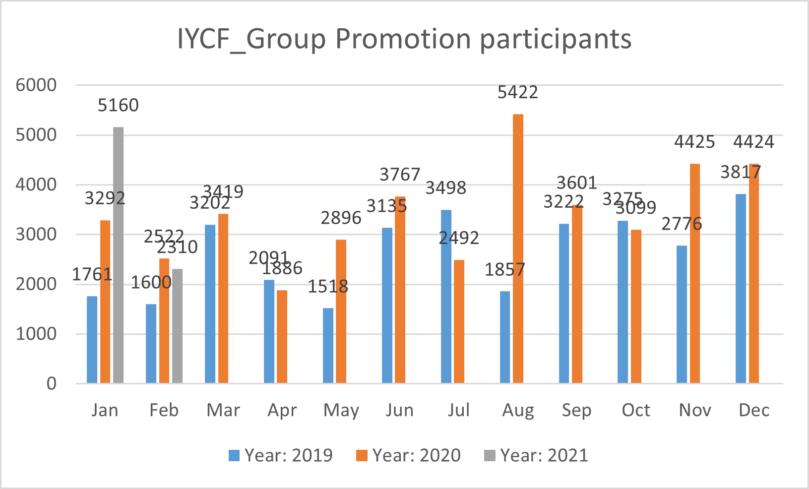 Protocols were also put in place to reduce the number of participants attending support group meetings and group promotion sessions to three to five per session (compared to the up to 20 participants per session pre-COVID-19). Numbers were determined based on the availability of space at each facility to ensure that all beneficiaries were able to maintain a one metre distance from each other. In order to ensure that, at a minimum, the same number of beneficiaries could be reached, the number of group counselling sessions was increased from approximately 100 sessions/month/facility pre-COVID-19 (four sessions per day) to 180/per month/facility (around seven sessions per day). Health facility records show that pre-COVID-19 (2019) the total number of sessions held was 6,436 while 15,642 sessions were held post COVID-19 (2020). Figure 1 shows the number of participants attending group counselling sessions per month during 2019 and 2020. The figures show an initial drop in participants after the pandemic hit around April 2020, as caregivers lost confidence in attending the health facilities but an overall increase in attendance across the year with some variation by month initially as training and infrastructural changes were carried out in each facility. Overall, the number of participants at group sessions increased from 31,752 in 2019 to 41,245 in 2020. To support the increased number of counselling sessions held, new counselling staff were recruited so that each facility had three trained IYCF counsellors compared to two pre-COVID-19.