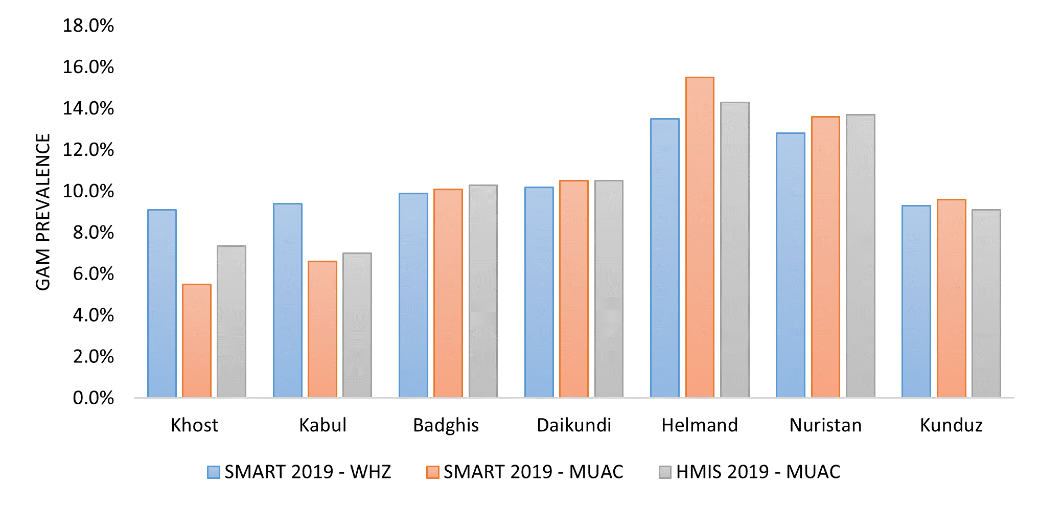 Figure 1: Comparison of GAM prevalence using 2019 HMIS data vs 2019 SMART surveys in selected provinces where all data was available