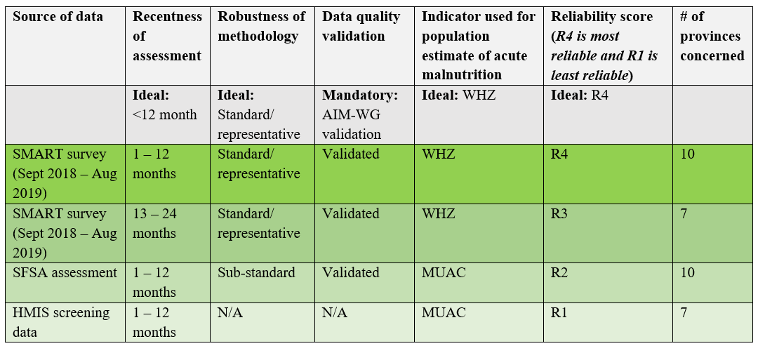 Geographic prioritisation and reliable estimates of caseloads for nutrition treatment and prevention services are critical for strategic and operational decision-making and the planning of quality services in the context of competing priorities and limited resources. The SMART survey is the main globally validated methodology for achieving timely and accurate nutrition data at provincial level. However, where SMART survey data is unavailable due to funding shortfalls and operational challenges, the experiences shared here demonstrate that it is possible to bring together a wider set of data for analysis to inform the HNO.