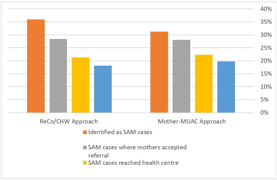 Screening for acute malnutrition at the community level is often the responsibility of CHWs. However, there is growing evidence that families, especially mothers, can play an important role in screening for acute malnutrition through the measurement of their child’s MUAC and for signs of oedema in their own communities. In the context of this programme, the Mother-MUAC approach provided better coverage of screening than the CHW-ReCo approach and a higher screening performance, demonstrated by the higher percentage of SAM children identified by mothers being admitted for treatment at an HC (63.2% in the Mother-MUAC approach versus 50.2% in the CHW-ReCo approach). There is some indication that this has led to shorter treatment duration which suggests that children are being referred more quickly for treatment, thereby potentially reducing malnutrition-related morbidity and mortality.