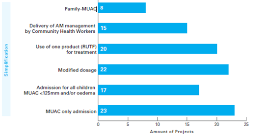 Using mid-upper arm circumference (MUAC) as the only admission criteria is the most frequently used simplification, followed by the use of a modified dosage of ready-to-use food, the use of a single product for treatment of both severe and moderate wasting and the modification of admission criteria. Some of the projects reviewed tested a combination of simplifications, such as the ComPAS and OptiMA3 trials which have brought together MUAC only admissions, modified dosage and the use of one product for treatment.