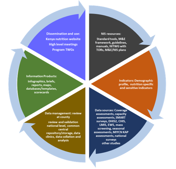 National Nutrition Information Systems (NIS) are critical to inform timely, high quality nutrition responses. In recent years, the Kenya NIS has been developed to include clear guidelines and tools, as well as standardised methodologies and processes, to support national nutrition monitoring and evaluation (see Figure 1). Through this process, Nutrition Standardized Monitoring and Assessment of Relief and Transitions (SMART) surveys were identified as the key source of acute malnutrition data at population level. Efforts have therefore been made since 2013 to streamline the processes of SMART surveys so that they contribute to a high quality, nationally-owned and led NIS.
