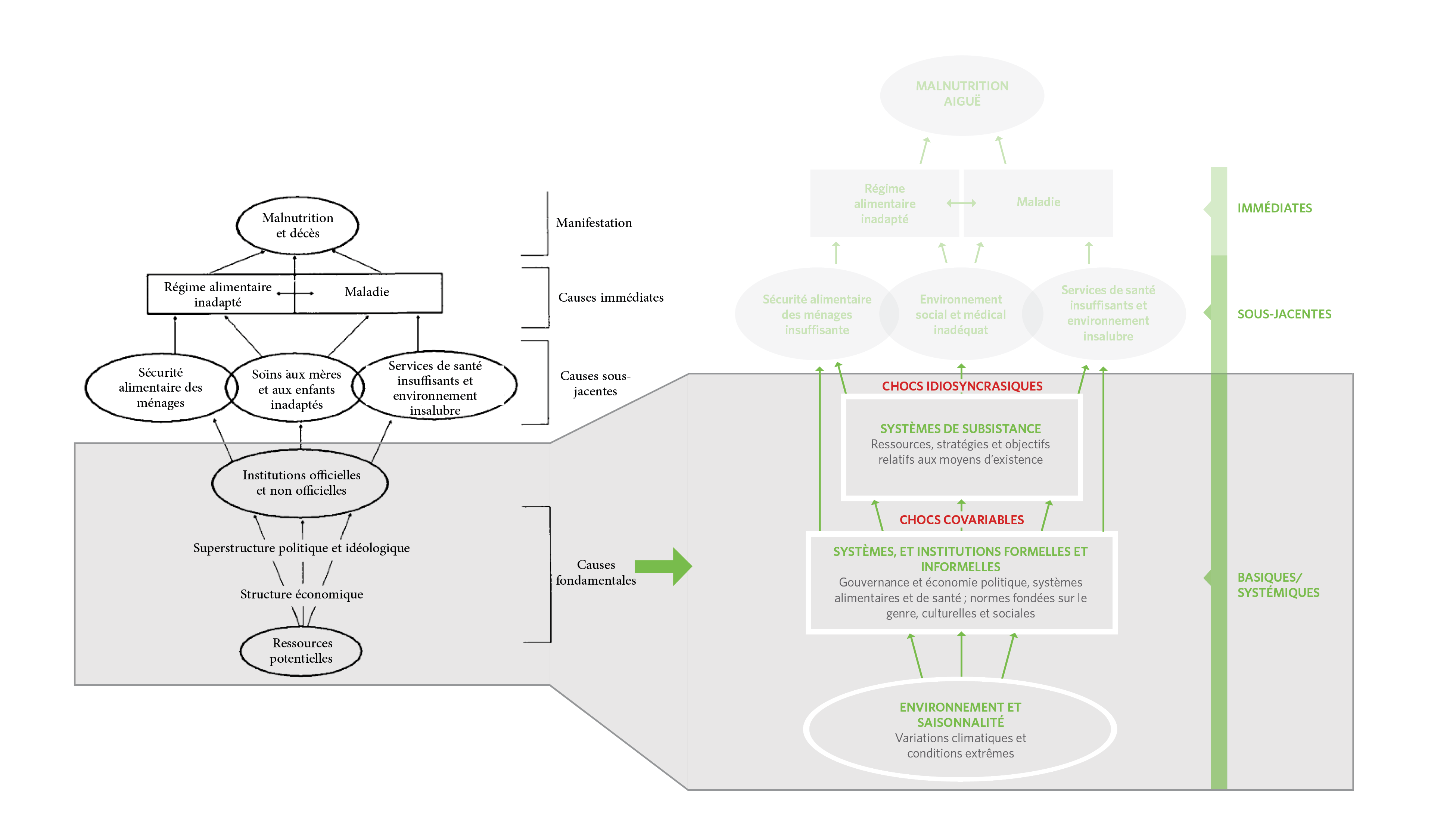 Le cadre conceptuel adapté (figure 2 – partie droite) reconnaît l’importance des causes immédiates et sous-jacentes, mais propose une nouvelle approche afin d’appréhender les facteurs fondamentaux de la malnutrition aiguë. Celle-ci s’appuie sur un corpus en évolution de connaissances et d’expériences concernant l’exposition aux catastrophes, les milieux arides, les systèmes de subsistance et la résilience. La version actualisée s’appuie sur le cadre original, mais conceptualise également les trois facteurs fondamentaux interdépendants suivants : l’environnement et la saisonnalité, les systèmes et les institutions officielles et non officielles, ainsi que les systèmes de subsistance. La vulnérabilité et la résilience des communautés et de leurs moyens d’existence face au climat, aux conflits et aux autres chocs y sont également exposées clairement.