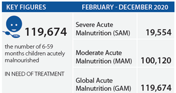 D’après les résultats de l’analyse IPC-AMN de Madagascar, la prévalence de la MAG a été estimée entre 10,5 et 16,8 %, celle de la malnutrition aiguë sévère (MAS) entre 1,6 et 3,7 % et celle de la malnutrition aiguë modérée (MAM) entre 9 et 14,4 %5. À partir de ces estimations, il a été calculé que 119 674 enfants âgés de 6 à 59 mois auraient besoin d’un traitement contre la malnutrition aiguë entre février et décembre 2020. Parmi ces enfants, 16 % auraient besoin d’un traitement contre la MAS.