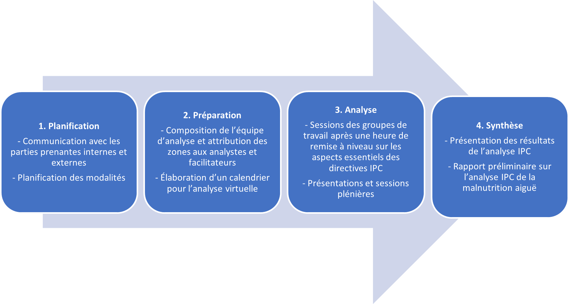 - La planification et la préparation d’une analyse IPC virtuelle exigent un certain temps : au moins sept jours avant la date fixée pour le début de l’analyse. Cette durée est supérieure à celle habituellement prévue lors d’une analyse en présentiel mais indispensable pour garantir la mise à disposition du plus grand nombre possible de données et d’informations nécessaires, afin que les groupes de travail puissent réaliser l’analyse dans un laps de temps plus court.