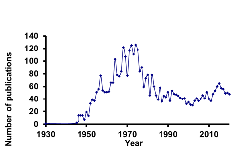 Figure 1 : Articles à comité de lecture traitant du « kwashiorkor » ou « malnutrition œdémateuse », publiés annuellement entre 1930 et 2020