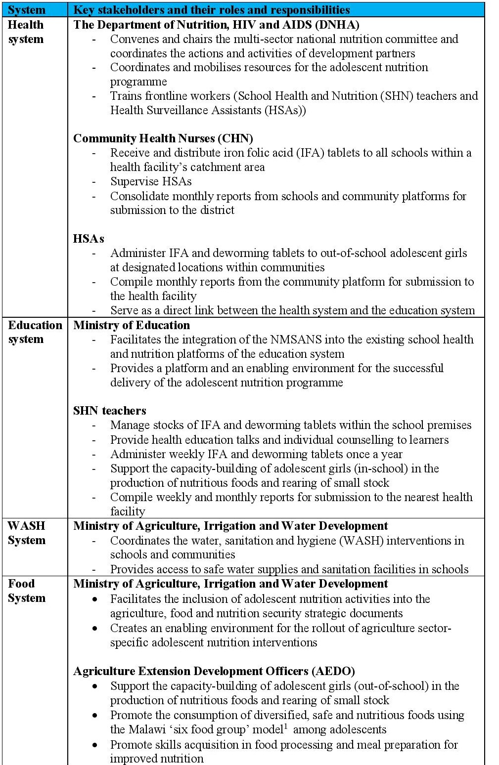 The NMSANS creates a platform to address the various information needs of adolescents including those related to sexual reproductive rights and life skills thereby contributing to a wider adolescent engagement agenda. This multi-sector collaboration among the various ministries in Malawi has assisted with programme rollout and the integration of adolescent nutrition within the health and education systems proving a sustainable, multi-sector approach to nutrition programming. Table 1 outlines the responsibilities of the various systems involved.
