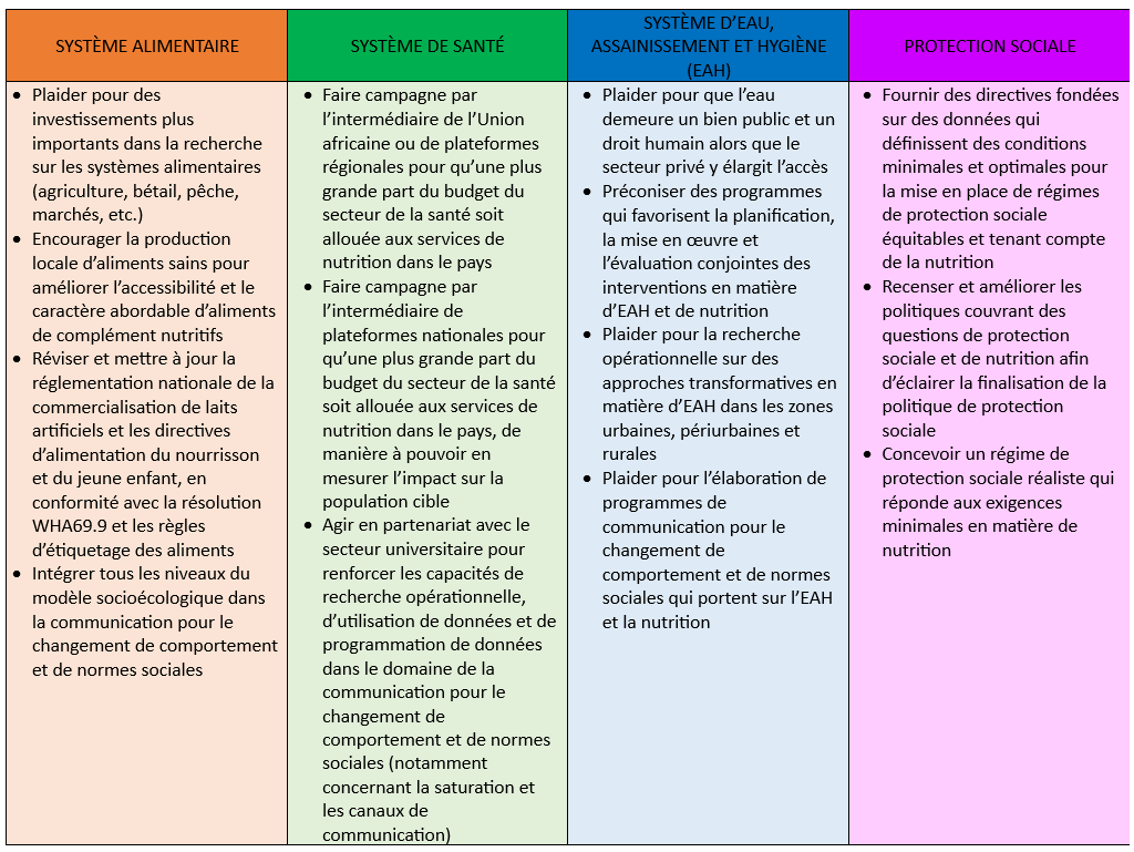Grâce à des consultations techniques avec les principales parties prenantes des pouvoirs publics (ministères, services et agences), des partenaires de développement (organismes des Nations Unies et organisations non gouvernementales) et des instituts de recherche affiliés à chaque secteur (santé, alimentation, protection sociale et EAH), les participants ont pu définir des politiques à adopter en priorité et déterminer le rôle de chaque secteur dans l’amélioration des régimes alimentaires des enfants, conformément aux mesures nationales jugées prioritaires au niveau régional. La figure 2 résume les principales mesures prioritaires définies pour chaque secteur.
