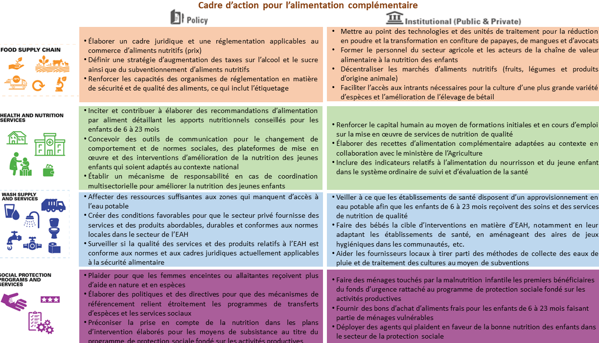 Après examen de l’analyse contextuelle, les participants à l’atelier de consultation se sont concentrés sur les obstacles et les goulots d’étranglement en ce qui concerne l’alimentation des enfants dans différents contextes et secteurs. Ils ont ensuite défini des mesures stratégiques à appliquer aux niveaux politique et institutionnel dans les quatre secteurs étudiés, conformément au cadre d’action (figure 1).