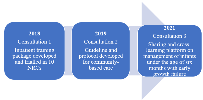 To facilitate adaptation of the MAMI Care Pathway to the Indian context, policy makers, national and international experts, academia, and technical and development organisations were convened as part of three expert consultations2 guided by an expert panel.3 These consultations, which took place between 2018 and 2021, aimed to facilitate experience exchange and learning, to develop consensus and to identify next steps on how to leverage and maximise existing services for early growth failure management (Figure 2).