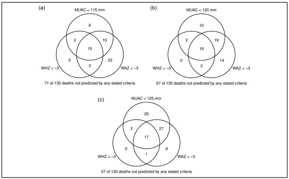 Combining indices resulted in an increase in sensitivity, but also in false positives, among children meeting case definitions. The Venn diagram (Figure 1) shows the number of children who died within one month of assessment with at least one severe anthropometric deficit detected with WAZ < -3, WHZ < -3 and MUAC < 115 mm (a), and also with MUAC < 120 mm (b) and MUAC < 125 mm (c). WAZ < -3 was the most sensitive criterion, as it identified a total of 51 children among those with severe anthropometric deficits at assessment who subsequently died (n 170). MUAC < 115 mm identified 33 children, and WHZ < -3 identified 20.