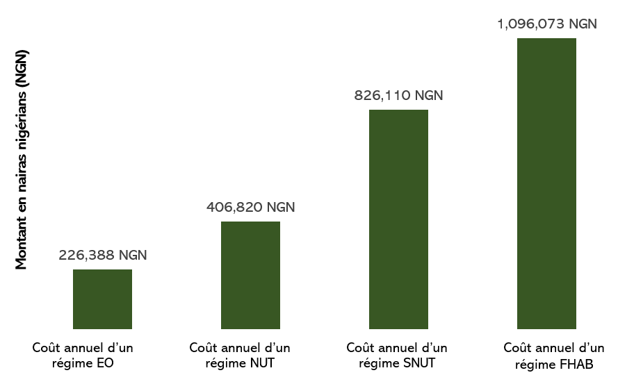 D’après les résultats de l’étude, le régime alimentaire ne satisfaisant que les besoins en énergie d’un ménage type de cinq membres a un coût minimum de 226 388 nairas par an, soit 500 dollars US (Figure 1). Le coût annuel du régime alimentaire fournissant les apports recommandés en énergie et en micronutriments, mais non conforme aux habitudes alimentaires prédominantes (c’est-à-dire le régime nutritif de coût minimum) est de 406 820 nairas, soit 900 dollars US. Le régime nutritif défini selon les aliments de base et le régime nutritif conforme aux habitudes alimentaires ont un coût annuel respectif de 826 110 nairas (1 830 dollars US) et de 1 096 073 nairas (2 430 dollars US). Au sein des ménages, le coût le plus élevé correspond aux besoins nutritionnels des femmes allaitantes (27 % des dépenses des ménages), puis des hommes (25 %), des enfants âgés de 11 à 12 ans (24 %), des enfants âgés de 9 à 10 ans (19 %) et des enfants âgés de 12 à 23 mois (5 %).