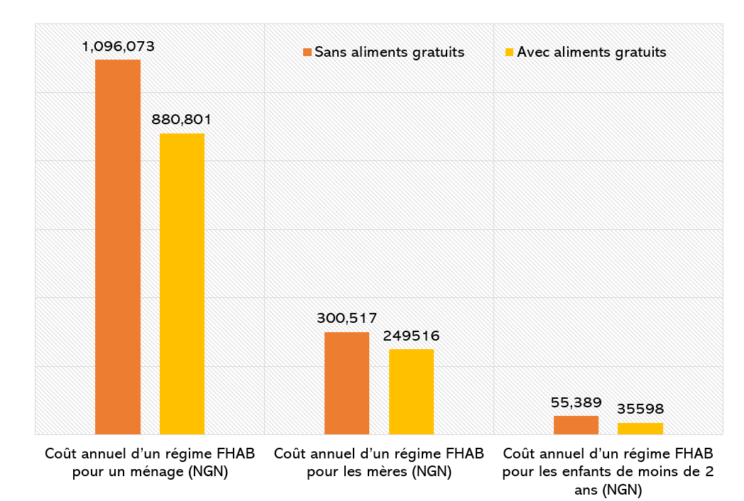 Si un ménage pauvre typique combinait les deux pratiques susmentionnées (scénario 3), chacun de ses membres pourrait accéder à un régime nutritif conforme aux habitudes alimentaires pour un coût annuel de 630 612 nairas (1 395 dollars US) au lieu de 1 096 073 nairas (2 430 dollars US), ce qui représente une réduction de 42 %. Ã l’échelle des membres du ménage, le coût d’un régime nutritif diminuerait de 40 % pour les mères allaitantes et de jusqu’à 36 % pour les enfants de moins de 2 ans.