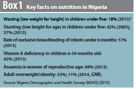 In response to the urgent need to scale up high-impact and cost-effective nutrition interventions, in April 2016 Nigeria adopted a new National Food and Nutrition Policy (NFNP) that reflects emerging issues such as the importance of the first 1,000 days and the upsurge in the prevalence of diet- related, non-communicable diseases (NCDs). The process of developing the new policy has been a lengthy one, involving multiple stakeholders (including the Ministry of Health and State Nutrition Offices) driven by the Ministry of Budget and National Planning and supported by development partners and non-governmental actors.
