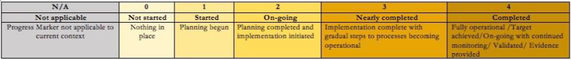 Scores range from 0 (nothing in place) to 4 (completed and fully operational) and are based on a combined attribution by the members of the different SUN country networks. SUN countries are encouraged to use the previous year's report as a reference to objectively assess whether there has been progress.