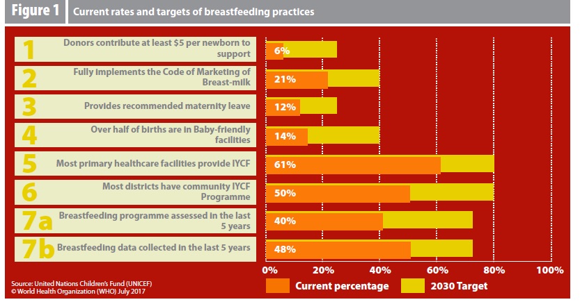 Worldwide, performance on recommended policies and programmes for breastfeeding is poor. In fact, only six countries out of 129 with available data were classified as achieving a recommended performance level in more than half of the indicators. In recognition of this, the collective has set targets for 2030 to galvanise action by policy makers (see Figure 1).