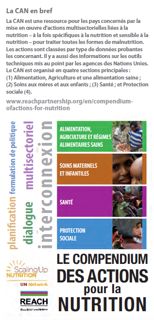 Le Compendium des Actions pour la Nutrition (connu sous le nom de CAN) est une ressource développée par le Réseau des Nations Unies pour le Secrétariat SUN/REACH selon un processus participatif qui utilise des experts externes et les agences de l’ONU. Le recueil a été initialement conçu comme une ressource pour les coordinateurs REACH afin de créer un dialogue multisectoriel au niveau des pays, en particulier dans la formulation des politiques liées à la nutrition et à la planification. En raison de la forte demande pour une ressource pratique de ce genre, le public cible a été ensuite étendu pour inclure les points focaux SUN gouvernementaux et d'autres travaillant sur la coordination et la planification multisectorielle dans le secteur de la nutrition.
