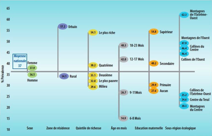 Des pratiques optimales de l’ANJE, l'une des déterminants-clés de la malnutrition de l’enfant, restent un défi, avec de grandes disparités (voir l'Illustration 1). À l'heure actuelle, seulement 37pour cent des enfants âgés de 6 à 23 mois reçoivent une alimentation de base (RMN, 2017).