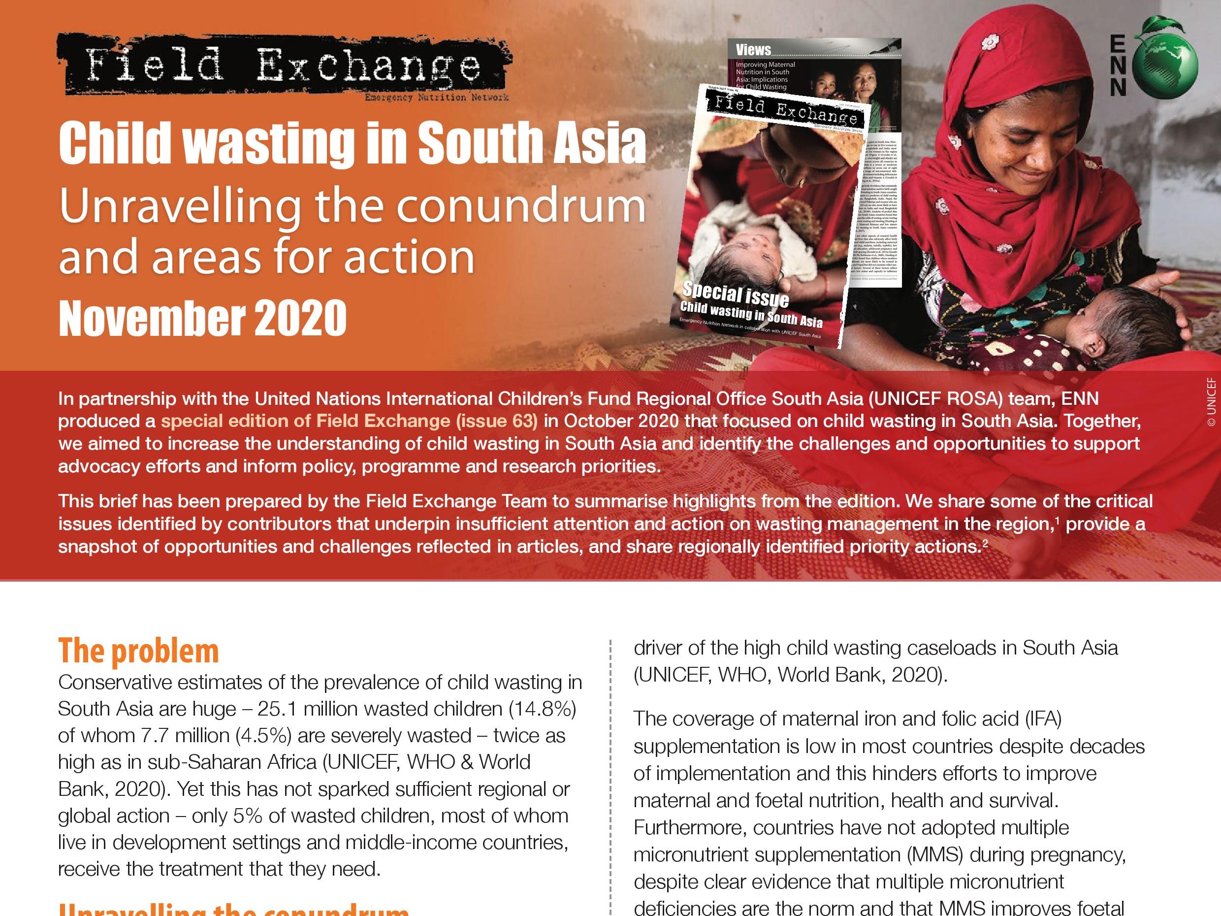 In partnership with UNICEF regional office for South Asia, ENN produced a special edition of Field Exchange (issue 63) in October 2020 that focused on child wasting in South Asia. The edition aimed to increase the understanding of child wasting in South Asia and identify the challenges and opportunites to support advocacy efforts and inform policy, programme and research priorities.